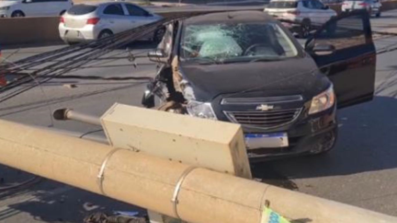 Imagens que circulam nas redes sociais mostram o estrago provocado pelo impacto. A condutora estava ao volante de um Chevrolet Onix preto.