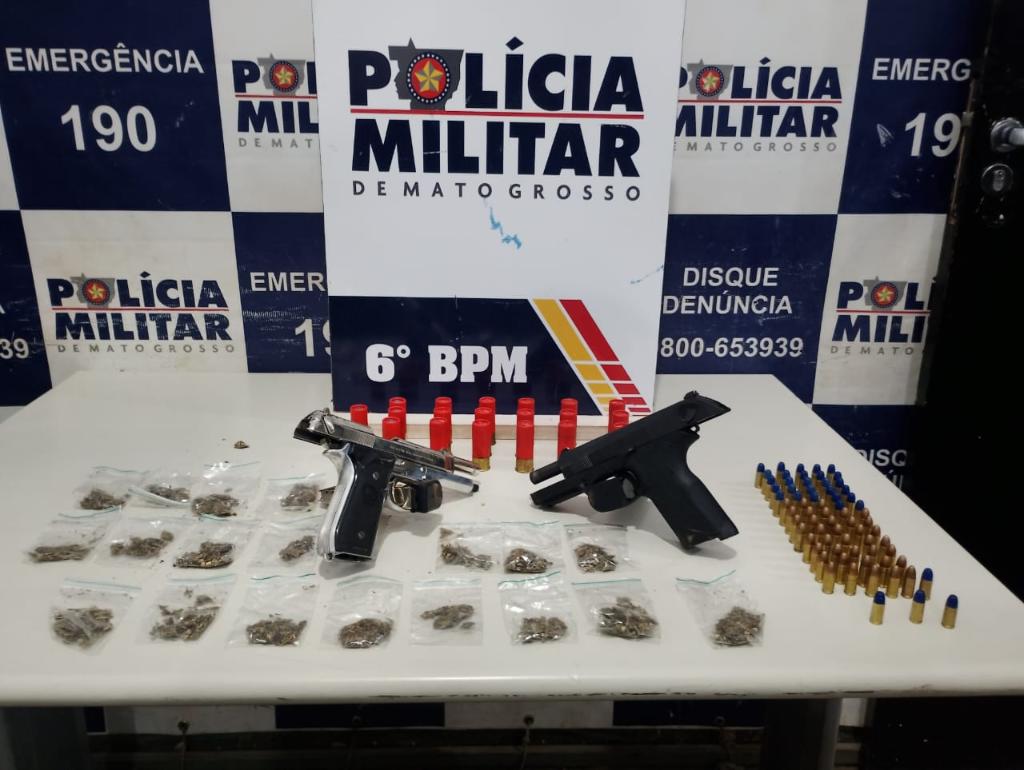 Policiais militares do 6º Batalhão prenderam três homens, entre 21 e 33 anos, e apreenderam quatro adolescentes, de 16 e 17 anos, por porte ilegal de arma de fogo e tráfico ilícito de drogas, na noite deste domingo (20.7), em Cáceres. Com os suspeitos, foram encontradas duas pistolas calibre .9mm, 88 munições de calibre .9mm e .12 e 19 porções de maconha.